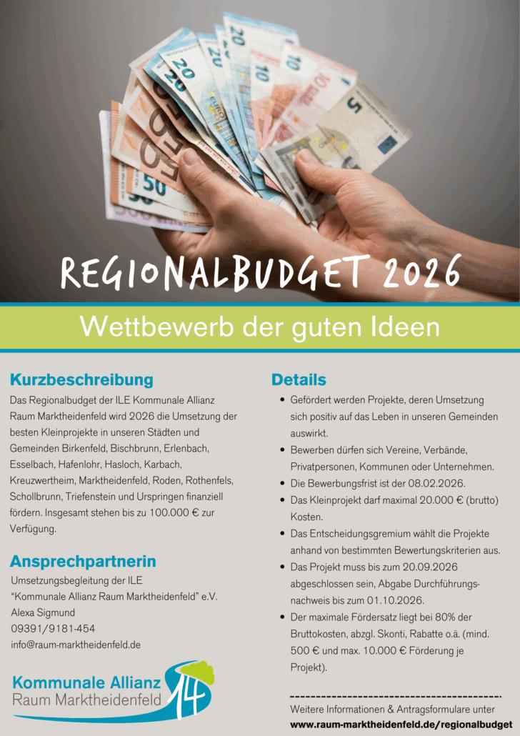 Mit dem Regionalbudget soll eine engagierte und aktive eigenverantwortliche Entwicklung unterstützt und die regionale Identität gestärkt werden. Dabei handelt es sich um eine Förderung von Kleinprojekten im Gebiet der Kommunalen Allianz Raum Marktheidenfelds mit Geldern durch das Amt für ländliche Entwicklung Unterfranken.